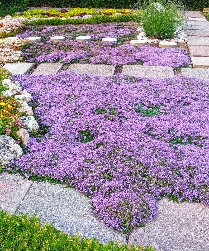 Imagine a carpet of rich green with bursts of stunning purple flowers. Creeping Thyme adds vibrant color and fragrance to your garden, creating a beautiful, low-maintenance landscape. Whether in pots or between pavers, its purple blooms bring elegance and charm to any outdoor space.